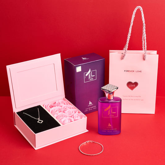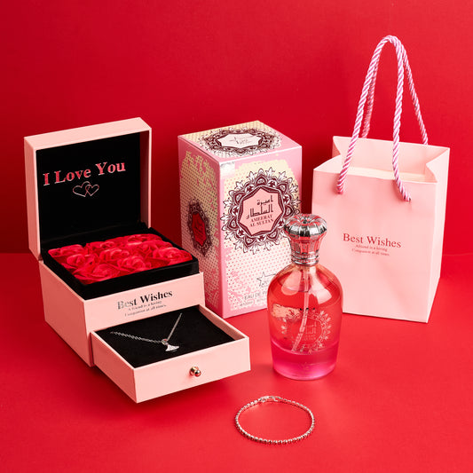 Set Cadou Pentru Ea (2) - Cutie Trandafiri + Bratara + Lant + Parfum Oriental Ameerat Al Sultan